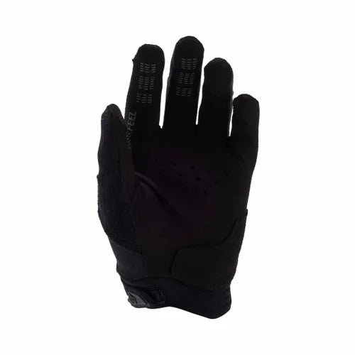 The Fox Defend Full Finger Youth Gloves are designed for mountain biking, offering a combination of lightness and durability. Made from 4-way stretch polyester, they feature a compression-molded cuff for a secure fit. Stretch mesh finger gussets enhance airflow and movement, while TRUFEEL internal TPR knobbies at the fingertips provide grip and control. The conductive Clarino palm allows for phone use without removing the gloves.